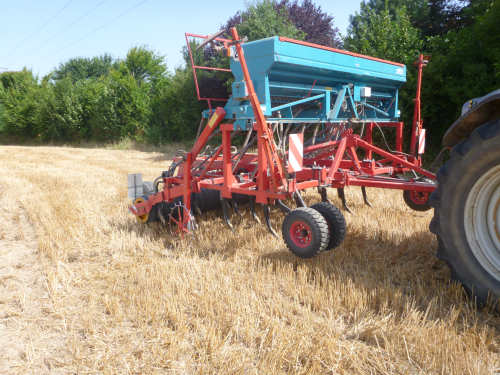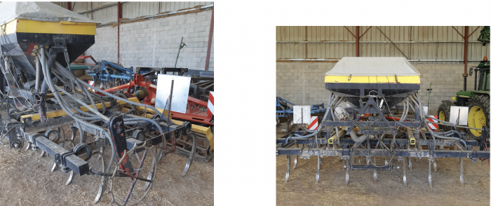L’agriculteur disposait d’un chisel à 3 poutres de 4 m sur lequel il a ajouté une poutre pour améliorer le dégagement et limiter le bourrage. Il a ensuite monté la distribution d’un semoir mécanique acheté accidenté (1500€). Par conséquent, le semoir devenant trop lourd pour être porté par le relevage du tracteur, un essieu d’enrouleur a alors été monté à l’arrière pour transformer l’outil en semi-porté.