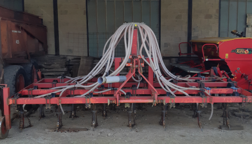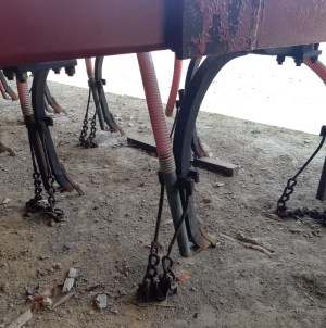 L’agriculteur a réélargi son chisel de 4 mètres pour un meilleur débit de chantier. Pour avoir un meilleur dégagement, une poutre a été ajouté à l’arrière du chisel qui comprend actuellement 29 dents réparties sur 4 rangées. Il a monté dessus une colonne de distribution et des descentes derrière chaque dent. 4 roues de jauges ont été montées (2 à l’avant et 2 à l’arrière) pour un meilleur contrôle de la profondeur de semis. Le semoir comprend aujourd’hui 29 dents queue de cochon de 40mm, équipées chacune d’un soc fin de type « AFC ». L’écartement de semis est donc de 17cm. Le recouverement de la graine est assuré par des chainettes situées derrière chacune des dents. La trémie frontale, servant également au strip-till, permet de mieux répartir les masses et de charger plus de semences (1500L) que si elle était placée sur le semoir.