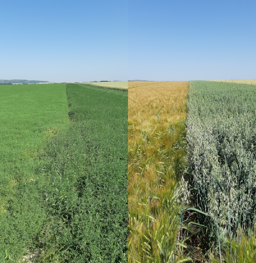 Après une tentative de multiplication de vesces infructueuse (plaquées au sol suite à un orage), un agriculteur de la Somme a décidé de les associer avec des féveroles de printemps. Ces dernières servent de tuteur et leurs graines sont valorisées dans les couverts. Ces deux cultures ont des dates de maturité décalées. Pour avoir une maturité coordonnée des deux espèces, il sème les féveroles en premier puis les vesces 3 à 4 semaines après. L’itinéraire technique est le même pour les deux espèces. Il récolte les deux ensembles puis trie les graines. Compte tenu de la maturité tardive de ces espèces (août), l’agriculteur s’est constitué un stock et sème les graines autoproduites de l’année n-1 en juillet.