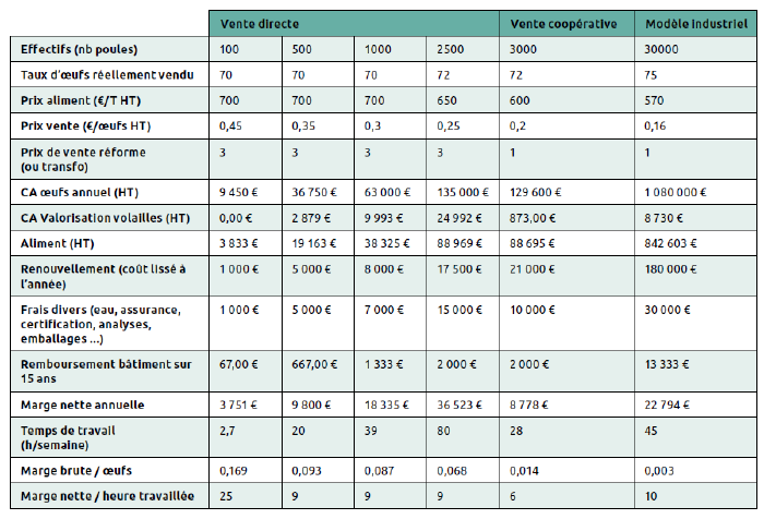 Voici un rapide comparatif des différents systèmes de production d'oeufs. Vous pouvez adapter ces chiffres au contexte actuel et vérifier la rentabilité de votre projet. On remarque que le taux de ponte à un impact énorme sur le revenu. Soyez également vigilant sur le prix et la qualité de l’aliment qui peut complètement modifier la rentabilité de l’atelier. Le maraîcher doit commencer par réussir un petit atelier complémentaire en ayant maximum une centaine de poules.