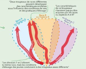 Le schéma ci-contre explique qu’il peut exister une diversité de compétences entre les animaux d’une même race selon les élevages et inversement des compétences similaires entre les animaux de deux troupeaux aux races différentes.