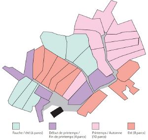 - Guy a échangé des parcelles avec d’autres agriculteurs pour regrouper ses terres autour de ses bâtiments. Même si certaines sont moins fertiles, il y gagne en autonomie grâce à la réduction des déplacements de bétail, quitte à récolter un peu moins. Les vaches restent dehors la majeure partie du temps, sauf en hiver lorsque l’humidité est trop importante. Le parcellaire destiné aux laitières est groupé, tandis que d’autres blocs sont réservés aux génisses et aux taries.