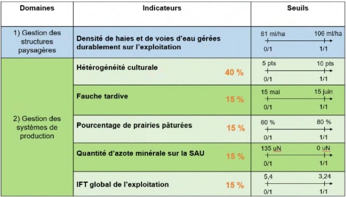 - Les domaines, indicateurs et seuils : Dans ce PSE, des indicateurs ont été retenus dans les deux domaines "Gestion des structures paysagères" et "Gestion des systèmes de production agricole". Les indicateurs sont les suivants :