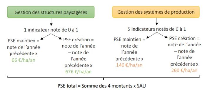 Le montant des PSE est évalué au travers d’indicateurs de mesures calculés chaque année qui permettent une proportionnalité entre performance et rémunération. Aucune pénalité n’est appliquée si les objectifs ne sont pas atteints, seuls les services effectivement rendus sont rémunérés. L’aide est surfacique (à l’hectare) et s’applique à l’ensemble de la SAU de l’exploitation.