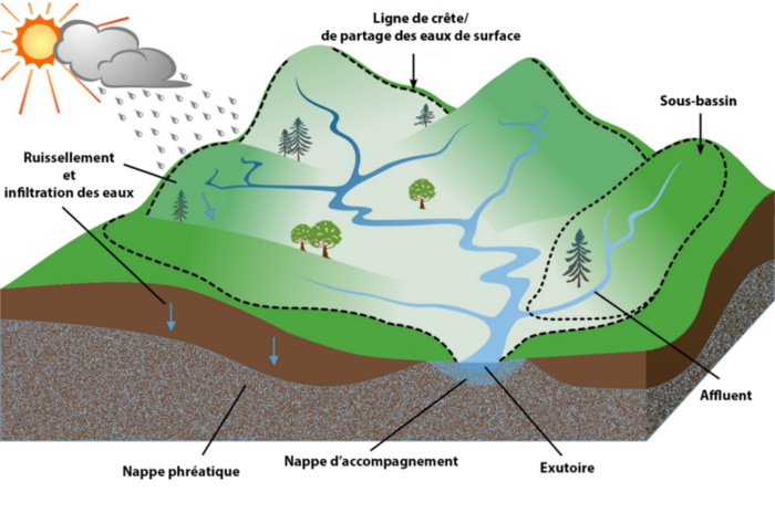 - Bassin versant : Défini comme l’unité de base de la gestion de l’eau, c’est un territoire qui draine l’ensemble des eaux vers un exutoire commun. Les bassins versants existent à différentes échelles, des petites parcelles aux grandes façades continentales. Ils sont délimités par des lignes de crête ou lignes de partage des eaux. On distingue le bassin versant (eaux de surface et souterraines) du bassin hydrographique (uniquement les eaux de surface formant le réseau hydrographique). Chaque grand bassin versant est composé de multiples sous-bassins.