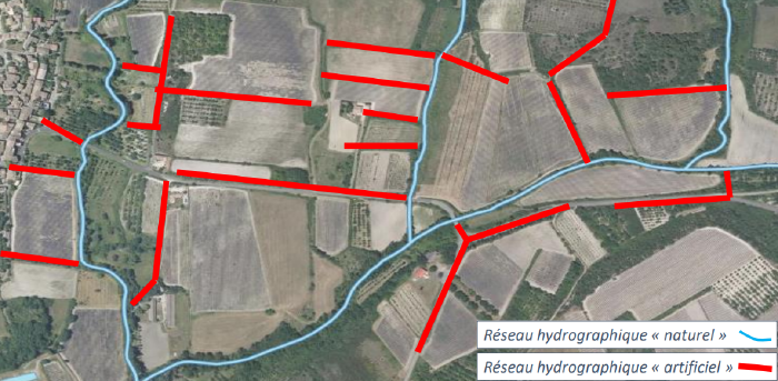 - Réseau hydrographique : Ensemble des cours d’eau permanents (traits bleus continus sur les cartes) ou intermittents (traits pointillés) s’écoulant sur un territoire donné. Les cours d’eau intermittents peuvent être dus à des sources saisonnières ou à l’écoulement des eaux de précipitation dans les talwegs.