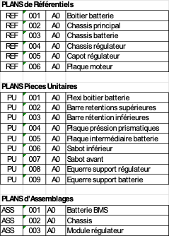 Note : Au sein de ce dossier technique, les plans dénommés REF-XXX-A0 décrivent les pièces qui constituent les sous-ensembles de la construction du Motoculteur-Re. Par exemple et pour certaines pièces comme le « Boitier batterie » REF-001-A0, si tous les dimensionnements sont spécifiés, la méthode constructive du boitier n’est pas précisée. Il appartiendra à chacun alors, suivant les outils disponibles et ses compétences, de sélectionner la méthode constructive qu’il décidera. Ces méthodes sont dénommées « les alternatives ». Quand l’alternative n’est pas précisée, la nomenclature de ces plans se termine par A0.