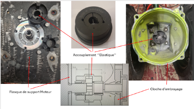 En cas d’incompatibilité diamètre axe / diamètre intérieur de la bague de l’accouplement, le recours a un tourneur peut devenir nécessaire. Dans le cas précis du rétrofit réalisé, l’accouplement standard était compatible.