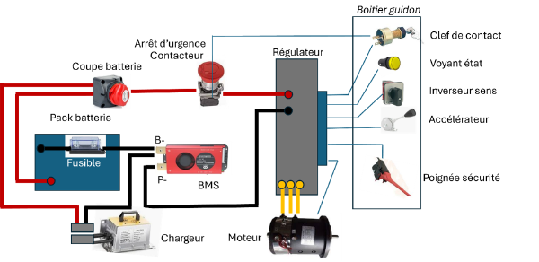 - C7 : câble noir – issue du BMS sur le pôle - et C8 : câble rouge + issue du coupe circuit forment un point de connectique de type Anderson pour le chargeur de batterie. La longueur de ces câbles et le positionnement de la connectique Anderson sera un choix à faire suivant le placement du chargeur, a poste ou extérieur au motoculteur-Re