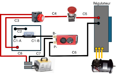 - C4 : câble rouge + : ce câble relie le « Court-circuit » au contacteur/coup de poing au sein du sous-ensemble « Bloc régulateur »