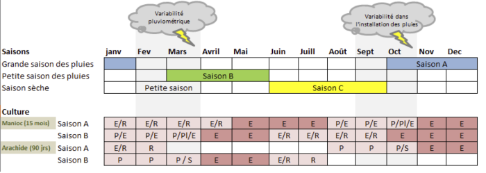- La récolte d’arachide est unique, celle du manioc peut être étalée sur plusieurs semaines.