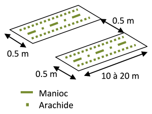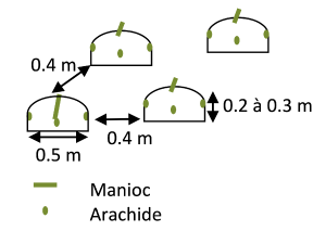 - Date : au début de la saison pluvieuse (octobre et/ou mars). La plantation de manioc et le semis d’arachide peuvent être réalisés au même moment ou à un mois d’intervalle maximum.