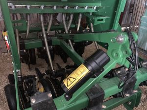 - Matériel utilisé : Semoir direct viticole. Après l’ouverture du sillon, la graine est déposée et rappuyée sur la bordure du sillon à l’aide d’une roue oblique. Sans ce système, la graine lève dès les 5 premiers mm de pluie et si cette pluie est suivie d’une sécheresse la plante meurt et ne repart pas. Le rappui effectué par le semoir direct sur le bord du sillon permet d’éviter ce phénomène grâce à un petit retard de levée de la graine. Ce semoir a coûté 20000€ à la CUMA. Il a deux trémies, une de 300L et une autre de 30L où il est possible de mettre différentes graines ou des fertilisants booster de croissance. Ce semoir direct est adapté au semis de grosses graines (féverole).