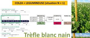 Composition : L'espèce privilégiée est le trèfle blanc nain en raison de ses qualités agronomiques (robustesse, bonne adaptation, faible coût initial, bonne repousse printanière) et de sa faible tendance à concurrencer la culture de rente, même s'il peut monter en hauteur lors d'années très humides. Le lotier est également tenté en mélange entre 0,5 et 1 kg/ha avec le semis du colza, mais il est très compliqué à établir.
