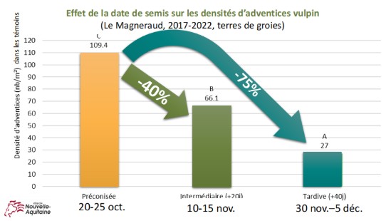 Décaler le semis de 20 jours permet de réduire la pression de certaines adventices (- 40% de densité vulpin en moyenne) et donc leur nuisibilité tout en maintenant le potentiel de rendement.