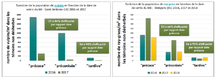 Le vulpin germe environ 150 DJ (degré jours) après un travail superficiel du sol. Un semis au 25 septembre est quasi concomitant avec la levée des vulpins. 100% de la population lève donc en même temps que la culture. En revanche, un décalage au 19 octobre permet de s’affranchir de 50 % des vulpins potentiels et de 80% pour un semis du 3/11.