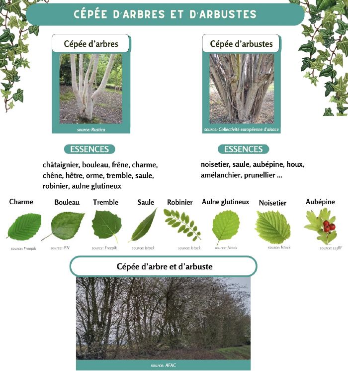 - Essences : noisetier frêne saule cornouiller sanguin châtaigner tilleul érable chêne hêtre charme aubépine prunellier