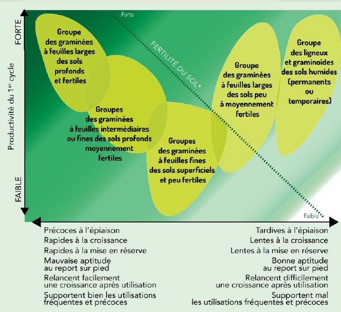 - graminées à feuilles intermédiaires, croissance printanière honorable, assez productives et mise en réserve assez rapide