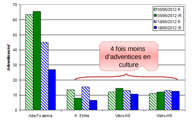 Le faux semis de printemps se justifie pleinement, il permet une réelle diminution de la pression adventice en culture comme indiqué sur le graphique ci-dessous :