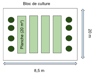 Maraîchage : La partie maraîchage couvre environ 1 hectare, organisée en 80 planches de 20 m² chacune (20 m de long × 1 m de large). Les planches sont regroupées en blocs de 8,5 m × 20 m (170 m²). Chaque bloc est cerné par deux lignes d’arbres fruitiers et d’arbres supports, ce qui permet d’intégrer le maraîchage dans une logique agroforestière. Cette disposition favorise à la fois la biodiversité, la protection contre le vent et la production de biomasse utile au paillage.