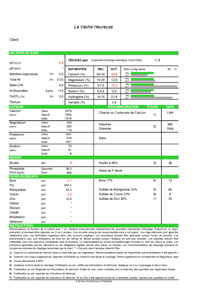 Le résultat de ces analyses de sol vient encourager les pratiques mises en place sur la ferme : "Nous apportons du calcium, du soufre, des oligo-éléments (...) qui sont les principaux facteurs limitants actuels" - explique Pierre Rubin.