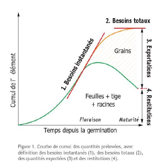 La quantité totale prélevée en situation optimale (également appelée « besoins totaux »), que l’on pourra décomposer entre quantité exportée et quantité restituée, s’effectue à partir d’un flux d’éléments biodisponibles complété par une éventuelle fertilisation.