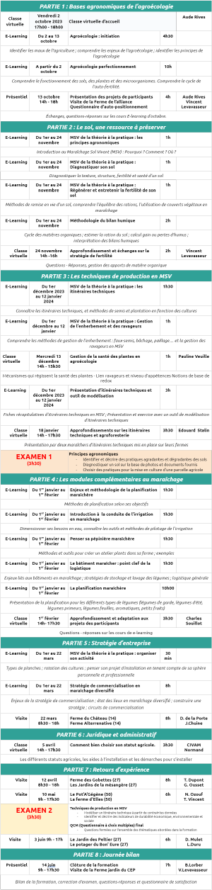 Les informations dans le calendrier ci-dessous sont prévisionnelles et sont susceptibles d’être modifiées en fonction de la disponibilité des formateurs et des imprévus inhérents à ce type de formation.