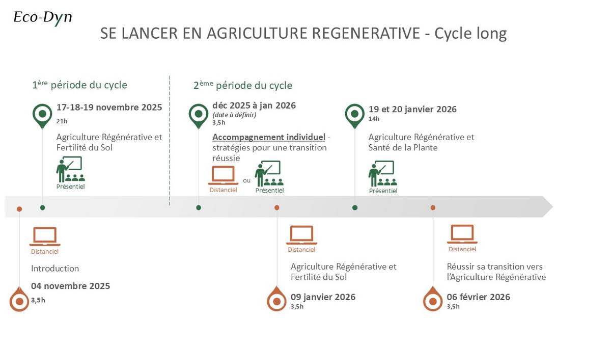 L’Agriculture Régénérative demande un engagement de chacun pour comprendre et réussir la transition de son système. Nous vous proposons un cycle de formation complet pour vous y accompagner au mieux. Ce cycle s’étale sur plusieurs mois en alternant les formats pour garantir un apprentissage et une progression optimaux pour chaque stagiaire. Il est constitué de classes virtuelles et de journées en présentiel, sur notre site de production (matériel et parcelles agricoles), permettant de combiner apports théoriques, sorties de terrain, ateliers pratiques et démonstration de chantiers. En complément, un accompagnement individuel sera proposé pour affiner les trajectoires de chacun.