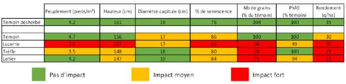 Toujours sur le même essai, lorsque qu’il y a un couvert, les performances des tournesols sont impactés comme en témoigne toutes les caractéristiques évaluées dans le tableau.
