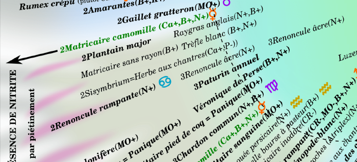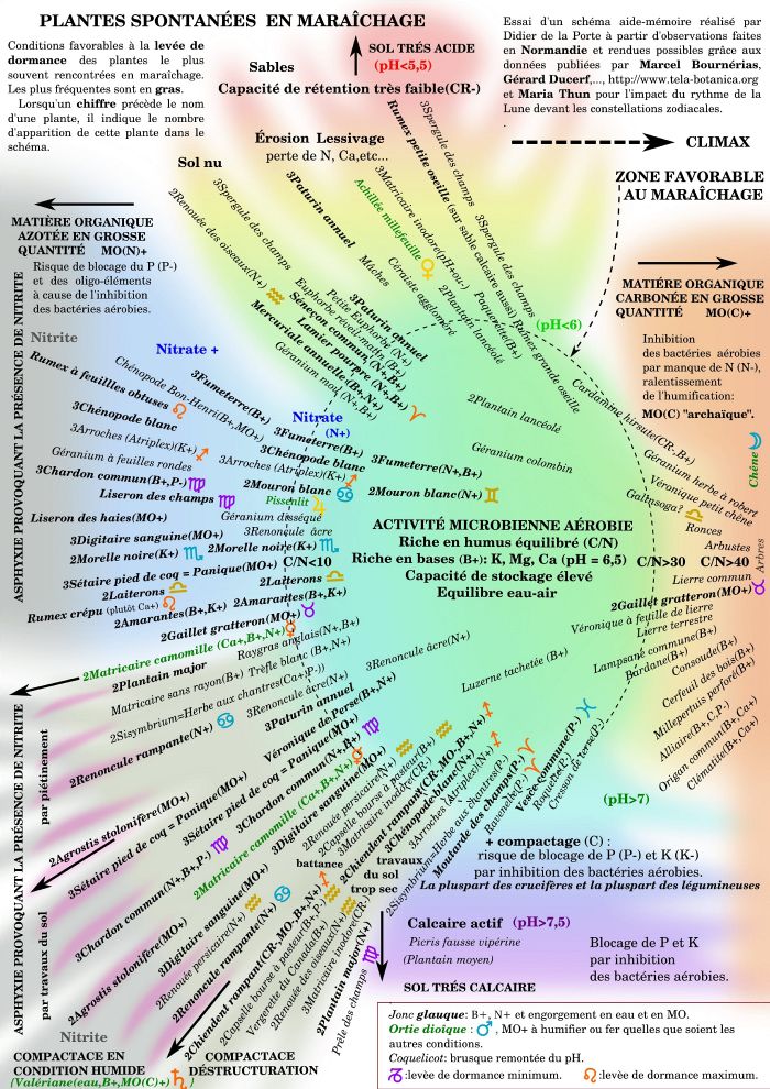 Les indications entre parenthèses donnent une information supplémentaire sur l'état de votre sol et les conditions nécessaires à la levée des plantes spontanées. Par exemple, le fumeterre est suivi d'un (b+), ce qui veut dire que le fumeterre est à la fois riche en nitrates et en oligo-éléments (Magnésium, Calcium, etc.).