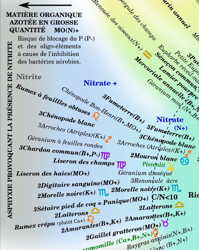 Les nitrites sont aussi retrouvés dans des milieux asphyxiés par l'eau, tels que les marais. Si une planche est envahie de renoncule rampante, de renouée persicaire ou d'agrostis stolonifère , il y a de fortes chances que le sol soit hydromorphe.