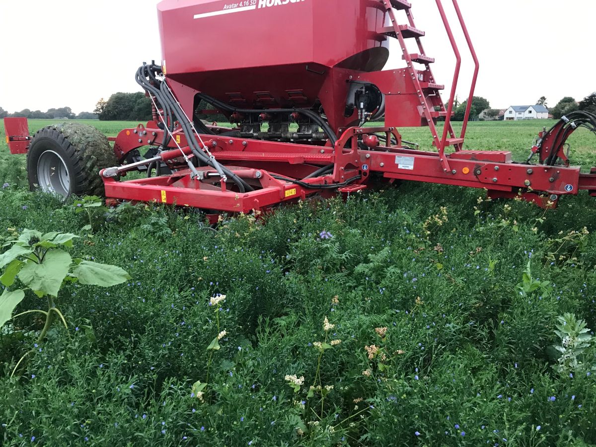 Avant l’implantation des blés (Wildfarmed et conventionnel), David met systématiquement en place un couvert végétal composé de sarrasin, phacélie, trèfle, tournesol et radis semé à 35 kg/ha à l’aide de son semoir de semis direct à dent HorshCO4.