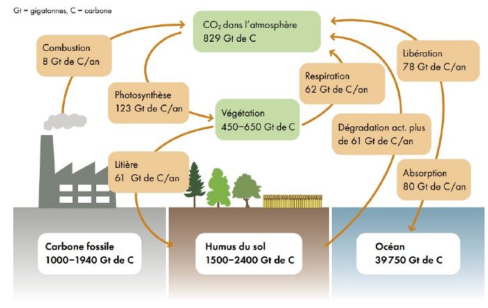 En 2018, 34 gigatonnes d’équivalents CO₂ ont été émises dans le monde entier, surtout par la combustion d’agents énergétiques fossiles. Dans le contexte du cycle mondial du carbone, ces émissions annuelles sont en réalité faibles (Fig. 1). Au total, on compte en effet 75 millions de gigatonnes de carbone sur Terre. La grande majorité (99,94 %) de ce carbone est cependant séquestré dans les calcaires. Seulement 0,05 % est fixé dans les océans et 0,0037 % dans les sols. Ces derniers contiennent deux fois plus de carbone que l’atmosphère et la biomasse terrestre mises ensemble, lesquelles représentent respectivement 0,001 % (Fig. 1). Pour comparer l’impact de différentes sources d’émission et de différents GES, les émissions sont souvent exprimées en équivalents CO₂ (éq. CO₂).