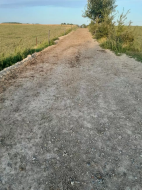 Dominique a fait vider les camions de terre chaulée directement sur un sol bien sec, sans aucune préparation (sans décaissement ni géotextile). Il l’a étalée et damée lui-même avec son Merlo pour former une couche de 30 à 40 cm. La terre chaulée était gratuite, seul le transport était à ses frais.