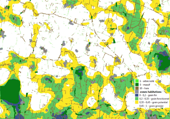 Ainsi, on peut cartographier le territoire en zones de grain plus ou moins fin, selon la densité et l’effet cumulatif des haies.