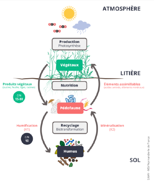 Lorsque les matières organiques sont intégrées au sol, dans la litière, elles sont soumises à l’action des organismes vivants du sol. Ces derniers vont intervenir de deux façons : une partie de la MO va être travaillée et humifiée, donc être ajoutée au stock d’humus existant, tandis qu’une seconde partie va être utilisée par la pédofaune pour se nourrir, donc être minéralisée et constituer une source de nourriture pour les plantes. On parle de minéralisation primaire lorsqu’elle a lieu directement sur la matière organique déposée, de minéralisation secondaire lorsque les microorganismes s’attaquent à l’humus.