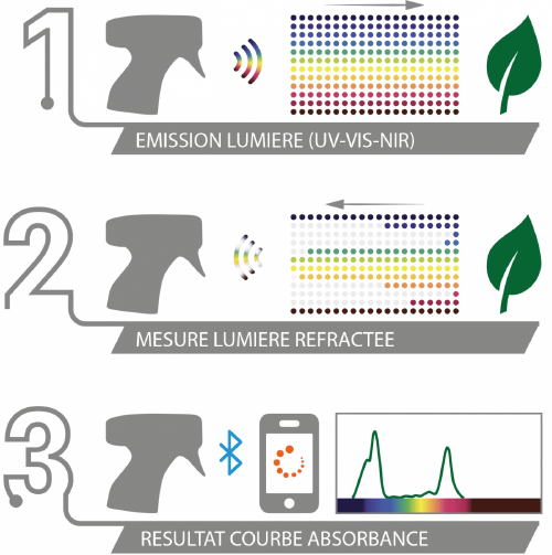 Le scanner envoie de la lumière proche infrarouge qui fait vibrer les liaisons entre les atomes. La courbe d'absorbance de la lumière mesurée en retour donne "une vision" de la matière. Ces informations permettent de prédire par l’Intelligence Artificielle (IA) les valeurs demandées : Potentiel Redox (Eh), pH et conductivité (CE). Ces mesures permettent de piloter les systèmes agroécologiques.