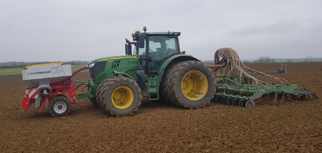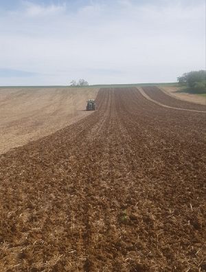 - Toutes les parcelles qui vont partir en culture de printemps (tournesol, orge de printemps et féveroles) en 2025 auront déjà un couvert mis en place pour couvrir le sol, afin d’éviter le salissement et l'érosion des sols. Le couvert est composé de 80 kg/ha de féverole (semence de ferme), de 2 kg de trèfle incarnat et de 11,3 kg du mélange Crucitech de chez Cérience (0,6 kg de moutarde d'abyssinie, 1,2 kg de radis fourrager, 5 kg de vesce commune de printemps, 3,5 kg de vesce velue, 1 kg de phacélie). Il a été semé fin août (un peu tard) au semoir à dents Simtech en 6 m de large (acheté avec 3 exploitations en SNC (Société en Nom Collectif) : la sienne, celle de son père et d'un tiers. Ils ont un seul parc matériel pour les 3 exploitations.) Le couvert sera détruit par le gel cet hiver ou au rouleau.