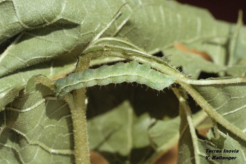 Larve : Chenille de 30 à 50 mm, de couleur grise avec des taches noires disposées de façon longitudinale sur chaque segment.