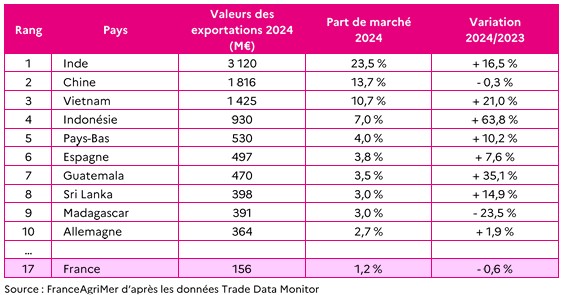 La France importe principalement des PPAM provenant d’Allemagne, d’Espagne, d’Italie, de Belgique, d’Inde, de Chine, du Maroc, de Turquie, du Brésil et des Pays-Bas.