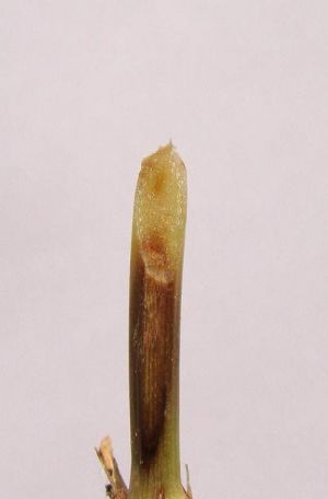 Une seule tache (rarement deux) est observée, avec des bords faiblement marqués, et présente souvent sous le premier nœud. Verse possible à maturité en cas de forte attaque.
