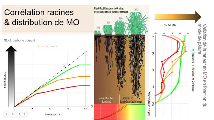 Voici les corrélations qu'il est théoriquement possible de faire entre profondeur du système racinaire et distribution du taux de carbone dans le sol, d'après les indications émanant d'outre Atlantique: