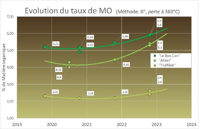 - Les deux dernières années 2021 et 2022, les prélèvements sont constitués de 12 cœurs de 18 mm régulièrement espacés dans les planches d'agroforesterie. Les analyses sont faites aux Etats-Unis selon le protocole américain Haney test, impliquant une détermination par perte au feu à 360°C (ce qui minore de 10% le résultat à profondeur de prélèvement identique). Les points 2022 sont analysés 2 fois au labo, mais sur un même échantillon (re-test). (La comparaison des spectres d'émission visible des prélèvements test et témoin permet de conforter le résultat des dosages.)