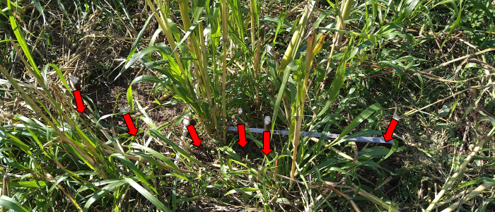 Selon Cédric, le pourcentage d'effeuillage (= le seuil de pâture) ET le stade de maturité sont cruciaux pour déclencher ces phénomènes d'exsudation racinaire. Ici, pour le sorgho les meilleures effets sont obtenus quand le seuil de pâture est 40% et au stade laiteux-pâteux, mais peut-être que ce seuil sera différent pour une autre plante, par exemple pour un dactyle. Il est important de surveiller et bien contrôler (en comptant ou en mesurant avec un mètre) cet effeuillage.