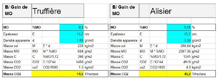 - Grâce à l'augmentation des taux de MO induite par des coefficients d'humification (K1) et de minéralisation (K2), qui sont eux aussi en augmentation du fait d'un changement d'adduction du carbone (cf les travaux de Claire Chenu), le carbone est soustrait aux dégradations atmosphériques usuelles qui engendrent habituellement 80% de pertes sous forme de CO2. L’impact CO2 est au-delà de 10 t CO2/hectare/an.