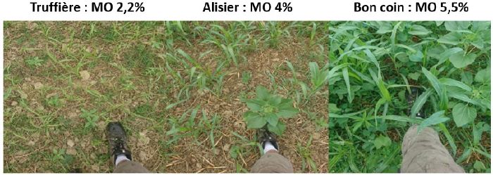 Cédric a observé des migrations/disparitions/apparitions des espèces d'adventices en fonction de l'évolution du sol. Il a également constaté qu'au delà de 4% de MO (sur 15 cm de profondeur de sol), le couvert prend le dessus sur les adventices :