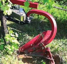 Ne cherchez pas à avoir des outils qui dépasseront fortement la ligne des souches. L’idéal est de ne pas dépasser (croiser) de plus de 2,5 cm. Autrement dit, pour une distance entre rangs de 2 m, on cherchera idéalement à avoir un outil ayant une largeur de 2,05 m. Cette faible largeur de dépassement (ou croisement) permet à l’outil de s’effacer plus facilement. Il gagne en réactivité, réduit les risques de blessures des souches et permettra au viticulteur de travailler à une vitesse plus élevée. La contrepartie d’un réglage trop juste, avec un faible croisement, est que le chauffeur doit maintenir un alignement parfait sur le rang pour éviter que le travail ne soit pas plus accentué d’un côté que de l’autre.