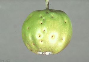 Les fruits sont déformés par la ponte des adultes. Les jeunes fruits contenant une larve tombent prématurément de l’arbre.