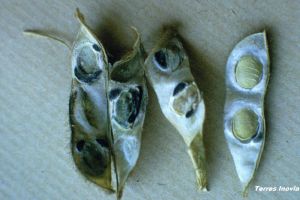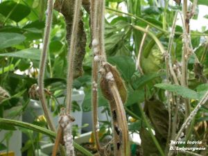 Sclérotes : En fin de cycle, des amas noirs de forme irrégulière (ressemblant à des crottes de souris) apparaissent à la surface ou à l'intérieur de la moelle des tiges et des gousses. Ce sont les formes de conservation du champignon.Période de présence :