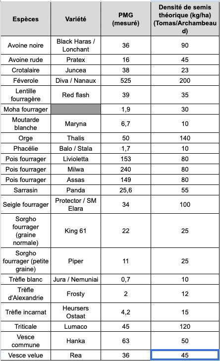 Ce tableau donne, pour chaque espèce : le Poids de Mille Graines (PMG) observé dans les tests et des données de densité de référence (Archambeaud, Thomas).